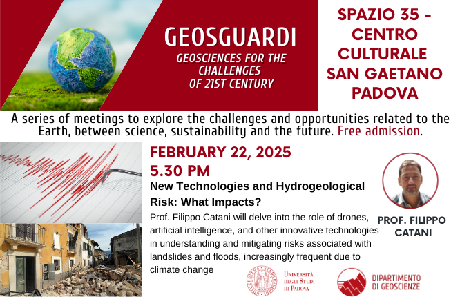 ![]() | Drones, AI, and Big Data: The New Frontiers of Hydrogeological Risk Prevention In the new meeting of the seminar series ‘GeoSguardi: Geosciences for the Challenges of the 21st Century’, scheduled for Saturday 22 February 2025 at the Centro Culturale San Gaetano, we will discuss how new technologies can help to prevent natural hazards and mitigate the effects of climate change | |