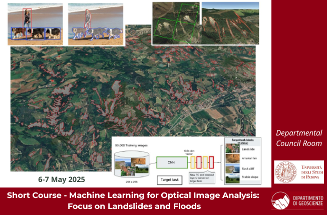 ![]() | Data, Pixels and Disasters: Landslides and Floods Seen Through Machine Learning On May 6–7, 2025 two intensive days of training on machine learning applied to optical image analysis and extreme natural events | |