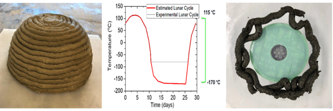 Severe environmental conditions like a large temperature variation between day and night, vacuum, and solar radiation are considered as the main obstacles for construction on the moon. A diurnal cycle on the moon lasts for over 29 earth days, with long periods of extreme hot and cold temperatures from 114 °C to −170 °C. High vacuum and the absence of oxygen also influence the mechanical properties of lunar constructions. In this study, the influence of the severe lunar environmental conditions such as extreme temperature variations and vacuum on the physical and mechanical properties of lunar regolith geopolymers were also investigated.