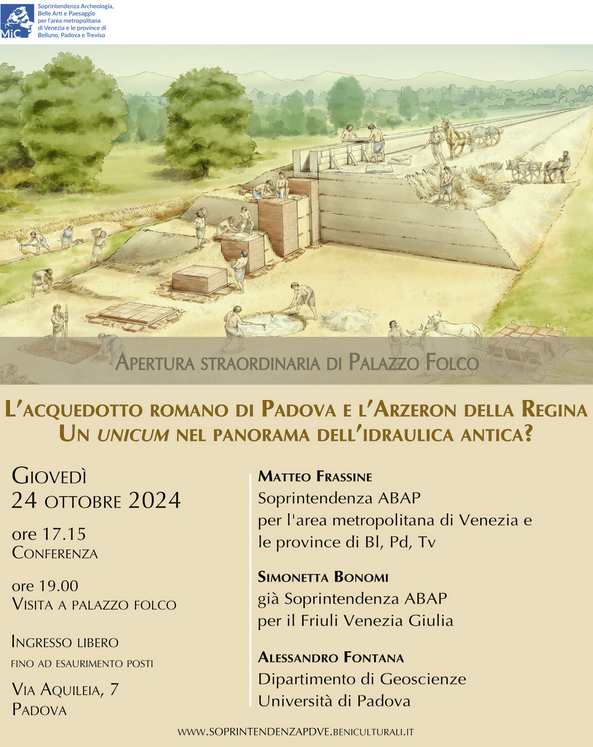 Giovedì 24 ottobre presso la sede della Soprintendenza di Padova a Palazzo Folco si svolgerà una conferenza dedicata all'acquedotto che alimentava la città in epoca romana e al terrapieno noto come Arzeron della Regina.