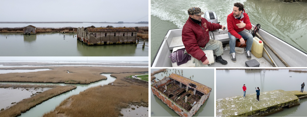 Natale Mantovan, pescatore che vive e lavora da sempre a Pila di Rovigo, si ferma con la sua imbarcazione per consentirci di osservare i dintorni. “In questo preciso istante siamo sopra un’aia dove veniva steso il riso, ma anche la piuma della canna, il famoso pennacchio per la costruzione di scope”, ci spiega, prima di illustrarci la funzione originaria dei resti degli edifici che vediamo più in lontananza.